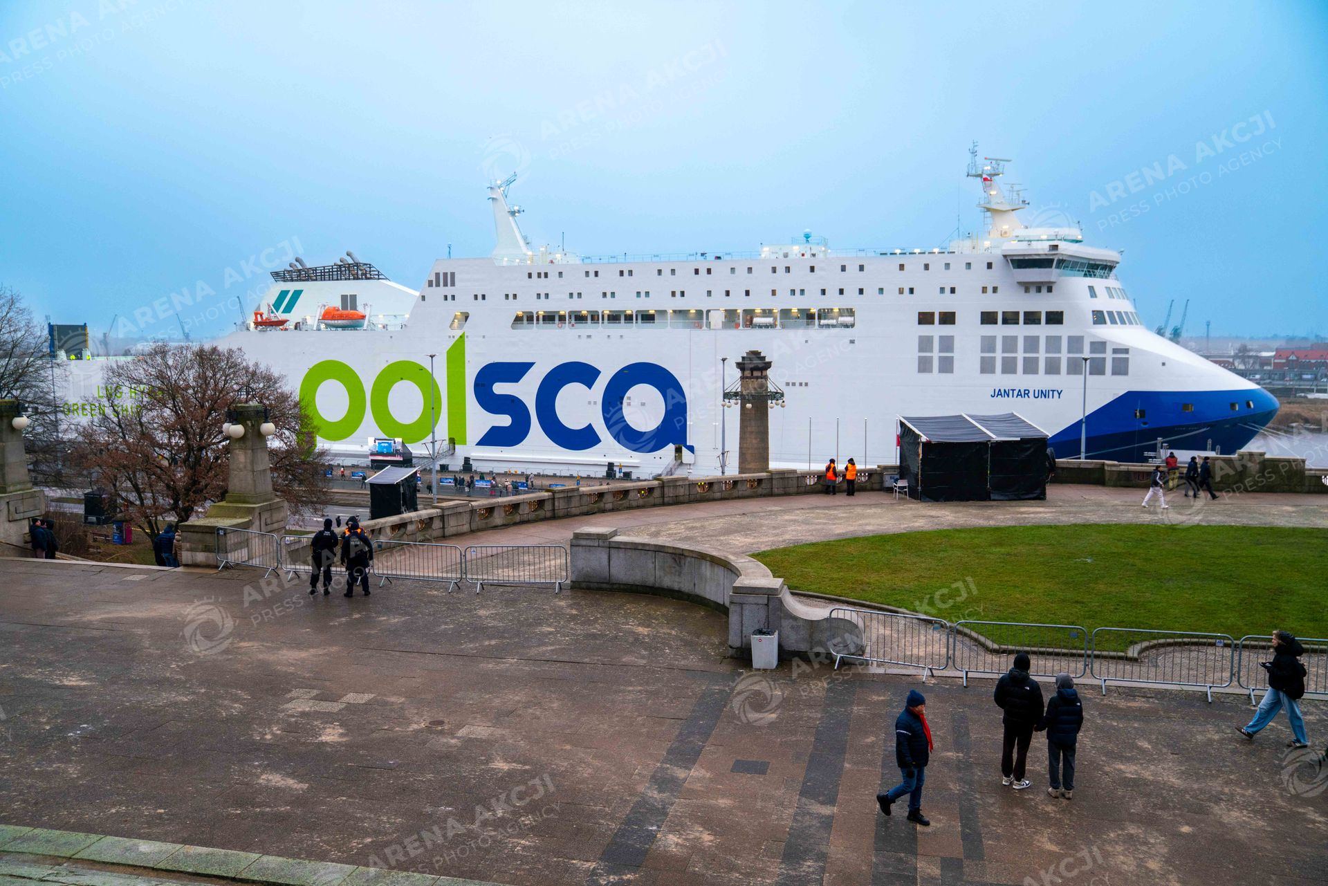 Szczecin 17.01.2026 Waly Chrobrego Ceremonia chrztu nowego promu Jantar Unity a najwiekszej i najnowoczesniejszej jednostki polskiej floty promowej. N/Z Prom Jantar Unity Fot. Marcin Jasinski/Arena Akcji