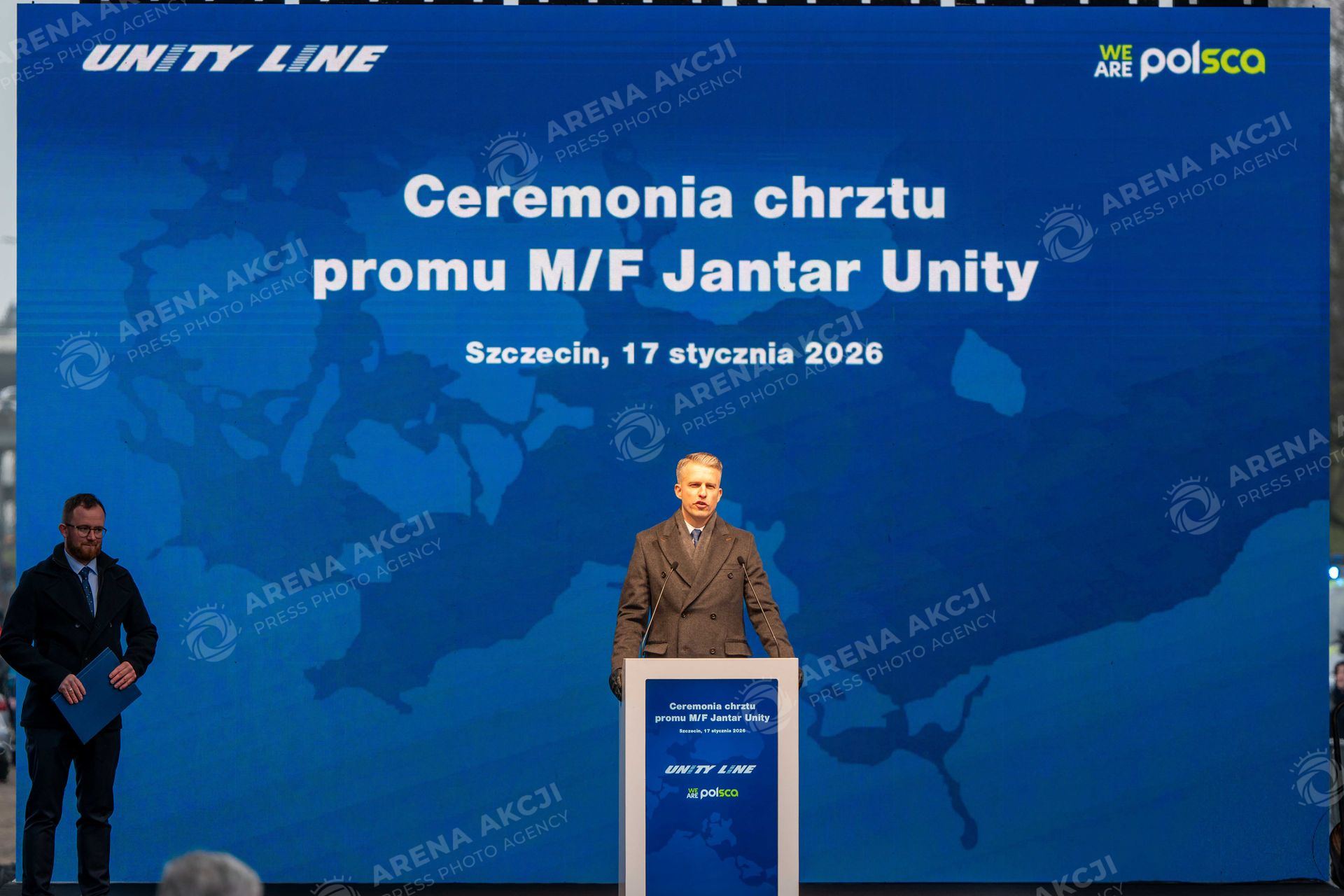 Szczecin 17.01.2026 Waly Chrobrego Ceremonia chrztu nowego promu Jantar Unity a najwiekszej i najnowoczesniejszej jednostki polskiej floty promowej. N/Z Prom Jantar Unity konferencja prasowa Fot. Marcin Jasinski/Arena Akcji