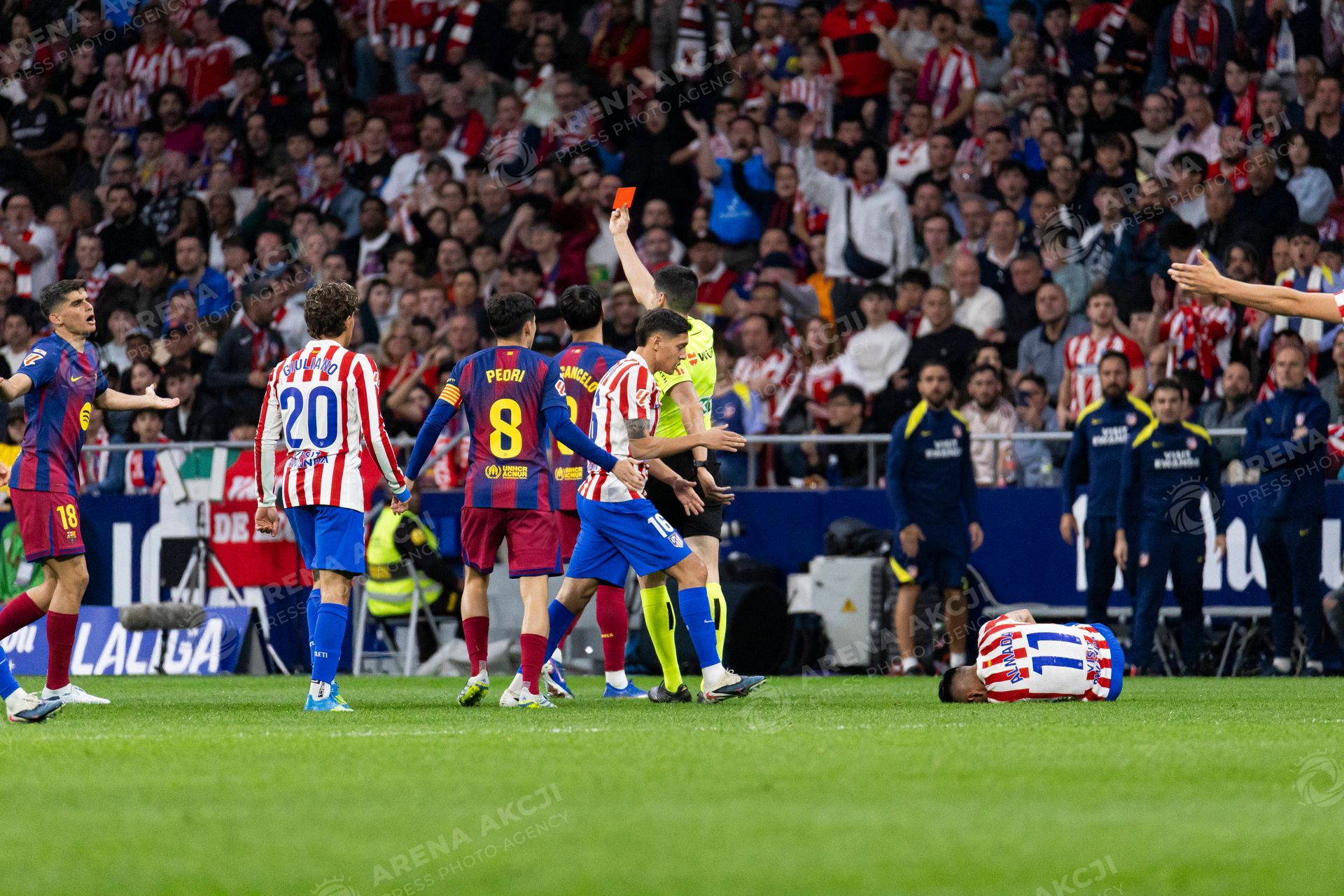 Spanish La Liga EA Sports soccer match Atletico Madrid vs FC Barcelona at Riyadh Air Matripolitano Stadium in Madrid, Spain. 04 April 2026 Red card to Gerard Martin (Photo by Cordon Press/Sipa USA) /ARENA AKCJI !!!POLAND ONLY!!!
