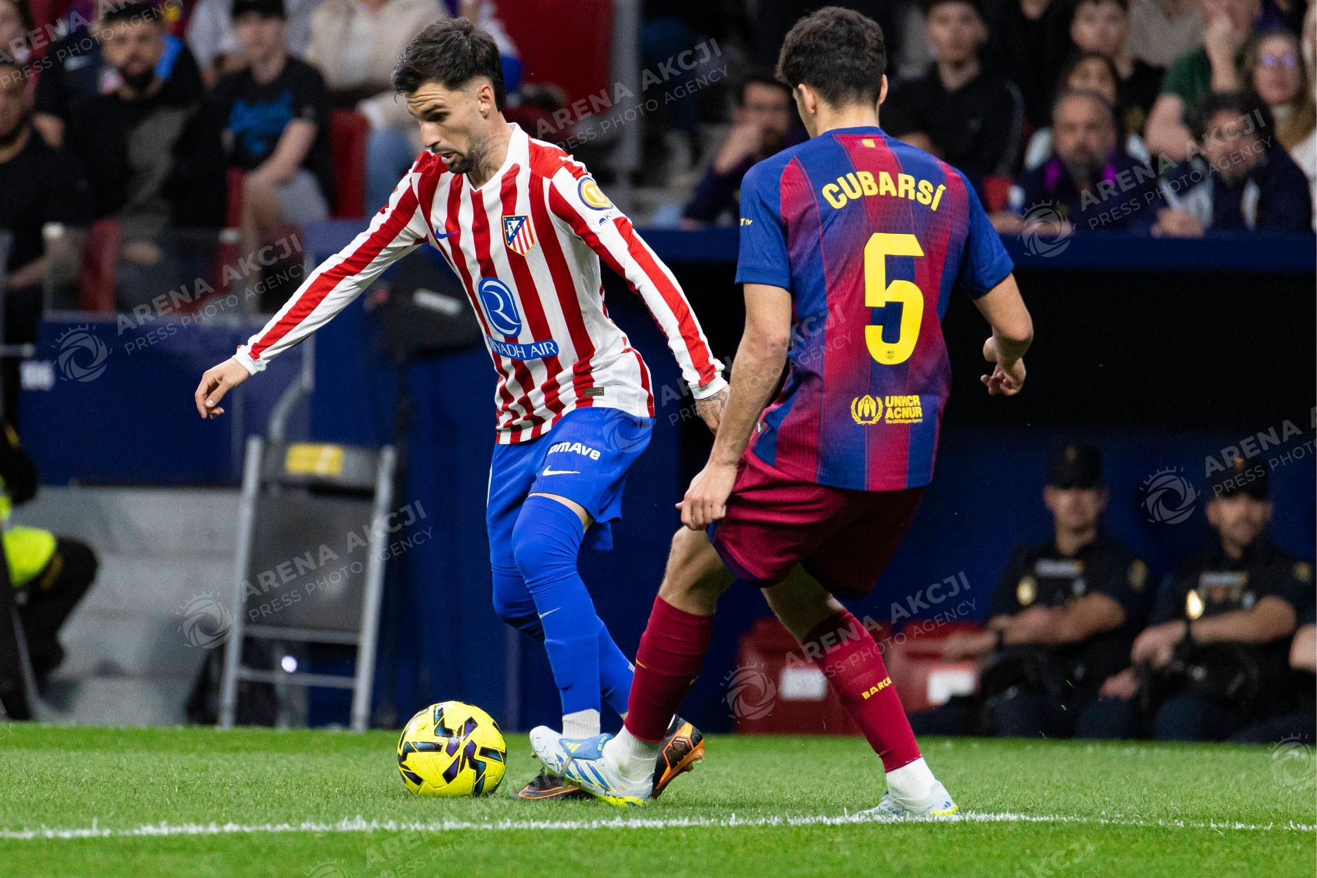 Spanish La Liga EA Sports soccer match Atletico Madrid vs FC Barcelona at Riyadh Air Matripolitano Stadium in Madrid, Spain. 04 April 2026 Alex Baena and Cubarsi (Photo by Cordon Press/Sipa USA) /ARENA AKCJI !!!POLAND ONLY!!!