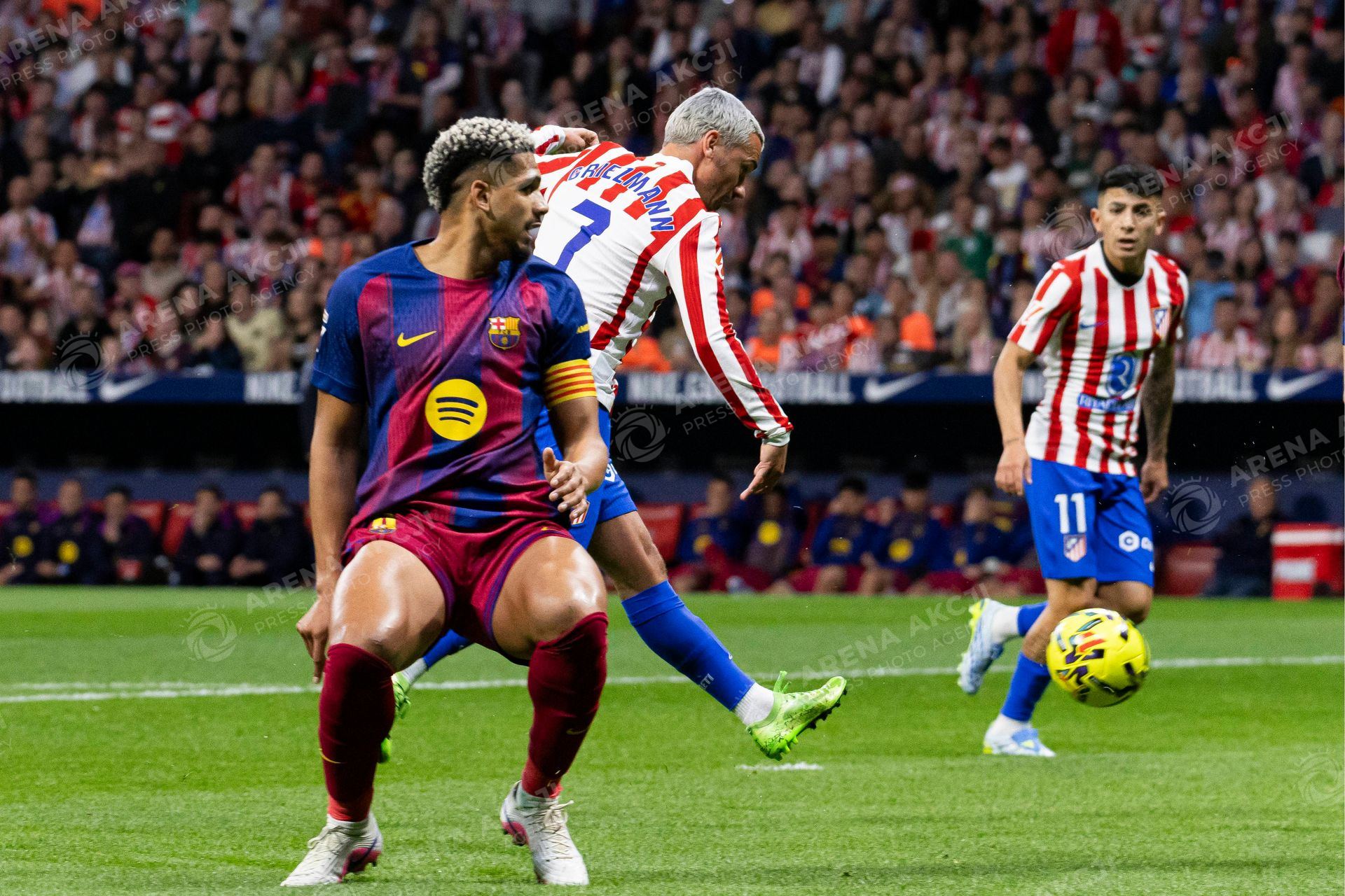 Spanish La Liga EA Sports soccer match Atletico Madrid vs FC Barcelona at Riyadh Air Matripolitano Stadium in Madrid, Spain. 04 April 2026 Griezmann and Araujo (Photo by Cordon Press/Sipa USA) /ARENA AKCJI !!!POLAND ONLY!!!