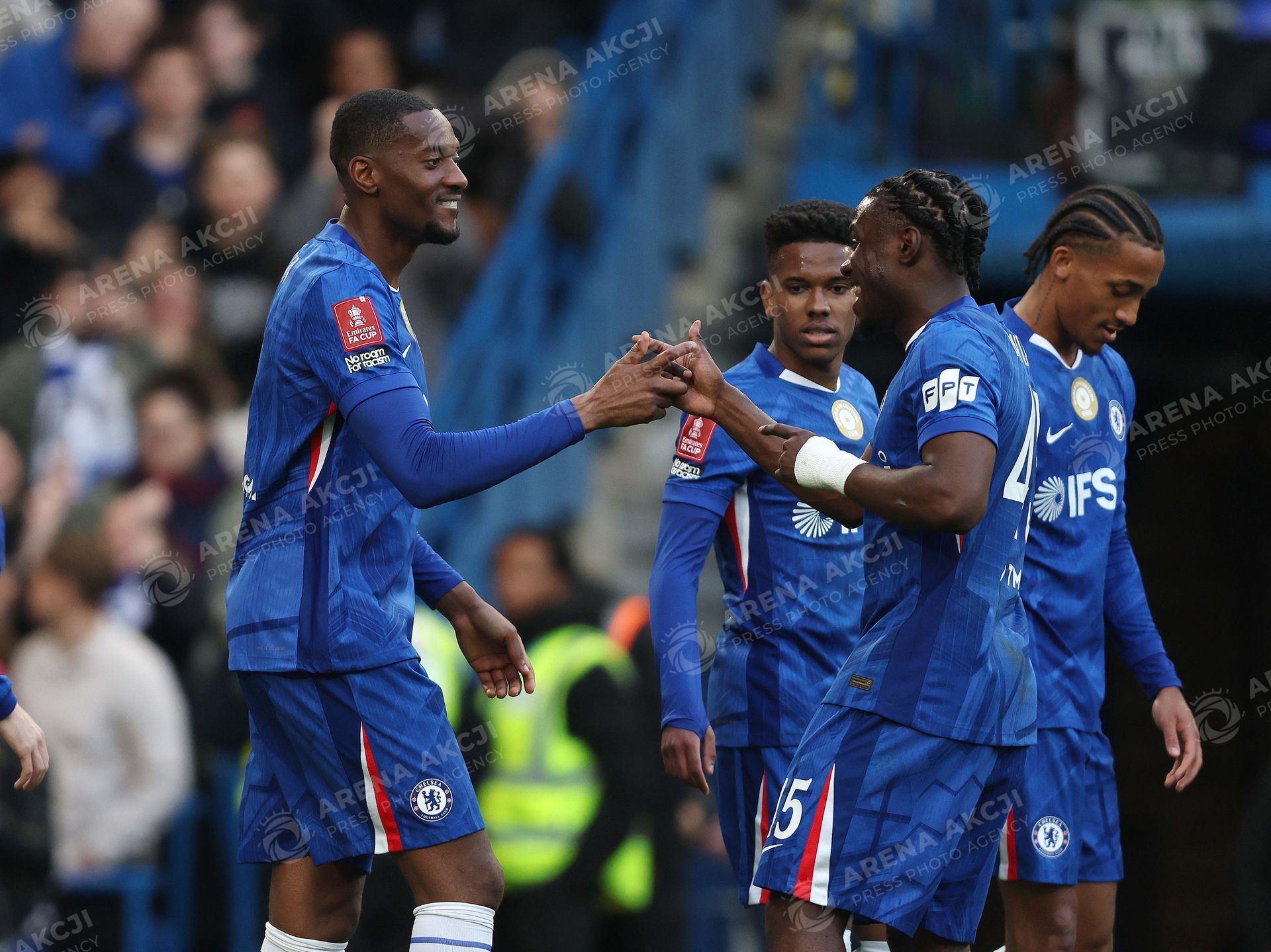 LONDON, ENGLAND, APRIL 04: GOAL 4-0, Tosin Adarabioyo of Chelsea goal celebration with Romeo Lavia of Chelsea after scoring a goal to put Chelsea 4-0 ahead during the match between Chelsea FC and Port Vale FC in the Emirates FA Cup Quarter Final match at Stamford Bridge Stadium in London, England, on April 4. (Photo by Daniel Weir) (Photo by Daniel Weir/Sports Press Photo/Sipa USA) /ARENA AKCJI !!!POLAND ONLY!!!