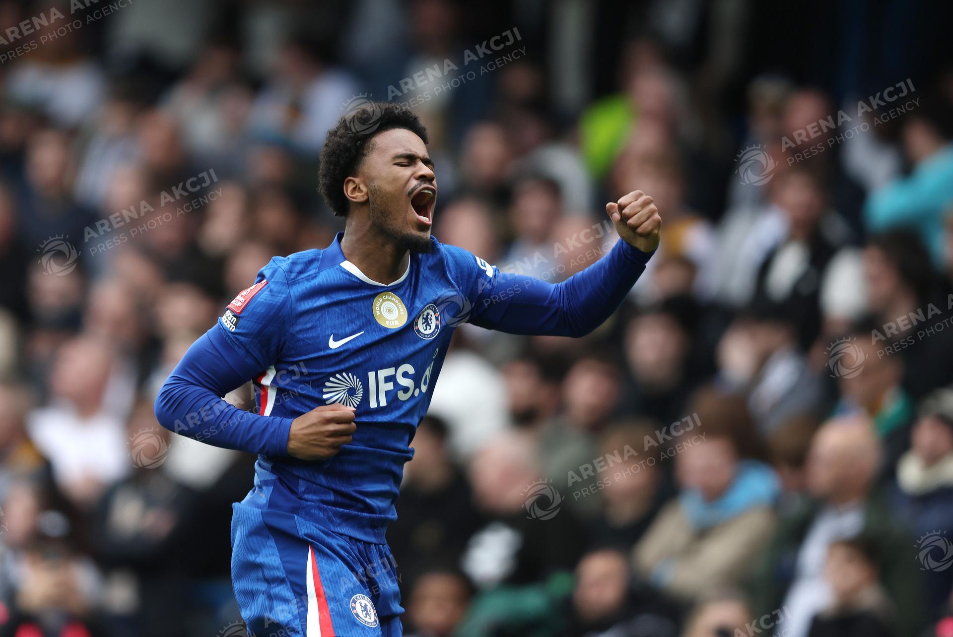 LONDON, ENGLAND, APRIL 04: GOAL 1-0, Jorrel Hato of Chelsea goal celebration after scoring a goal to put Chelsea 1-0 ahead during the match between Chelsea FC and Port Vale FC in the Emirates FA Cup Quarter Final match at Stamford Bridge Stadium in London, England, on April 4. (Photo by Daniel Weir) (Photo by Daniel Weir/Sports Press Photo/Sipa USA) /ARENA AKCJI !!!POLAND ONLY!!!