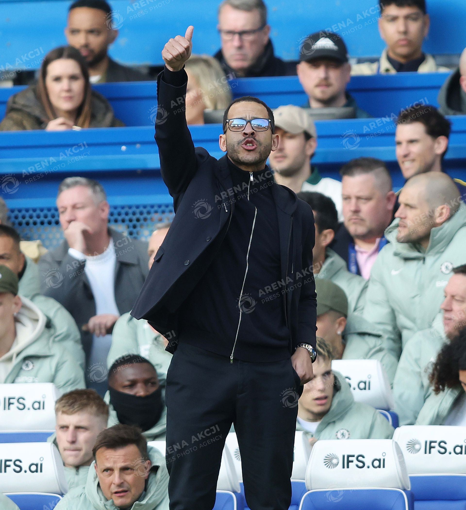 LONDON, ENGLAND, APRIL 04: Liam Rosenior Manager of Chelsea gives his players the thumbs up during the match between Chelsea FC and Port Vale FC in the Emirates FA Cup Quarter Final match at Stamford Bridge Stadium in London, England, on April 4. (Photo by Daniel Weir) (Photo by Daniel Weir/Sports Press Photo/Sipa USA) /ARENA AKCJI !!!POLAND ONLY!!!